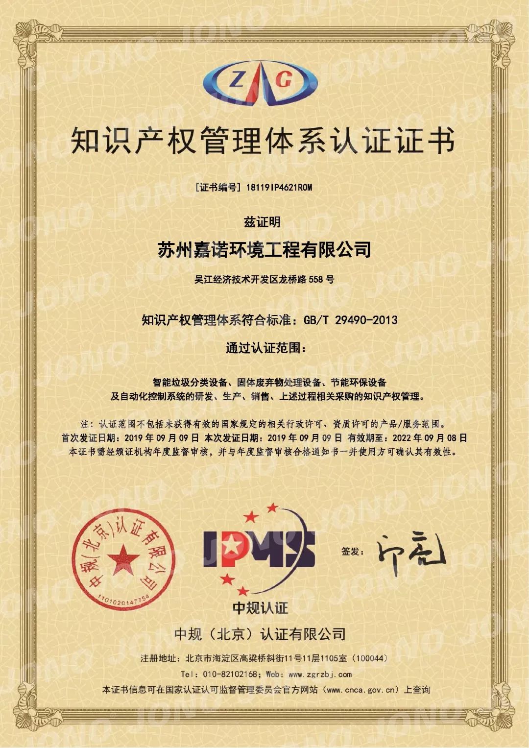 自創(chuàng)立伊始,嘉諾始終高度重視專利、軟件著作權(quán)、商標等知識產(chǎn)權(quán)的管理工作,于2019年1月開始籌備建立知識產(chǎn)權(quán)管理體系,歷經(jīng)數(shù)月的實施運行,于2019年8月順利通過了中規(guī)(北京)認證有限公司認證審核,并于今日收到了由該認證機構(gòu)頒發(fā)的《知識產(chǎn)權(quán)管理體系認證證書》(證書編號:18119IP4621ROM),認證嘉諾知識產(chǎn)權(quán)管理體系符合標準:GB/T 29490-2013,發(fā)證日期2019年09月09日,有效期至2022年09月08日。